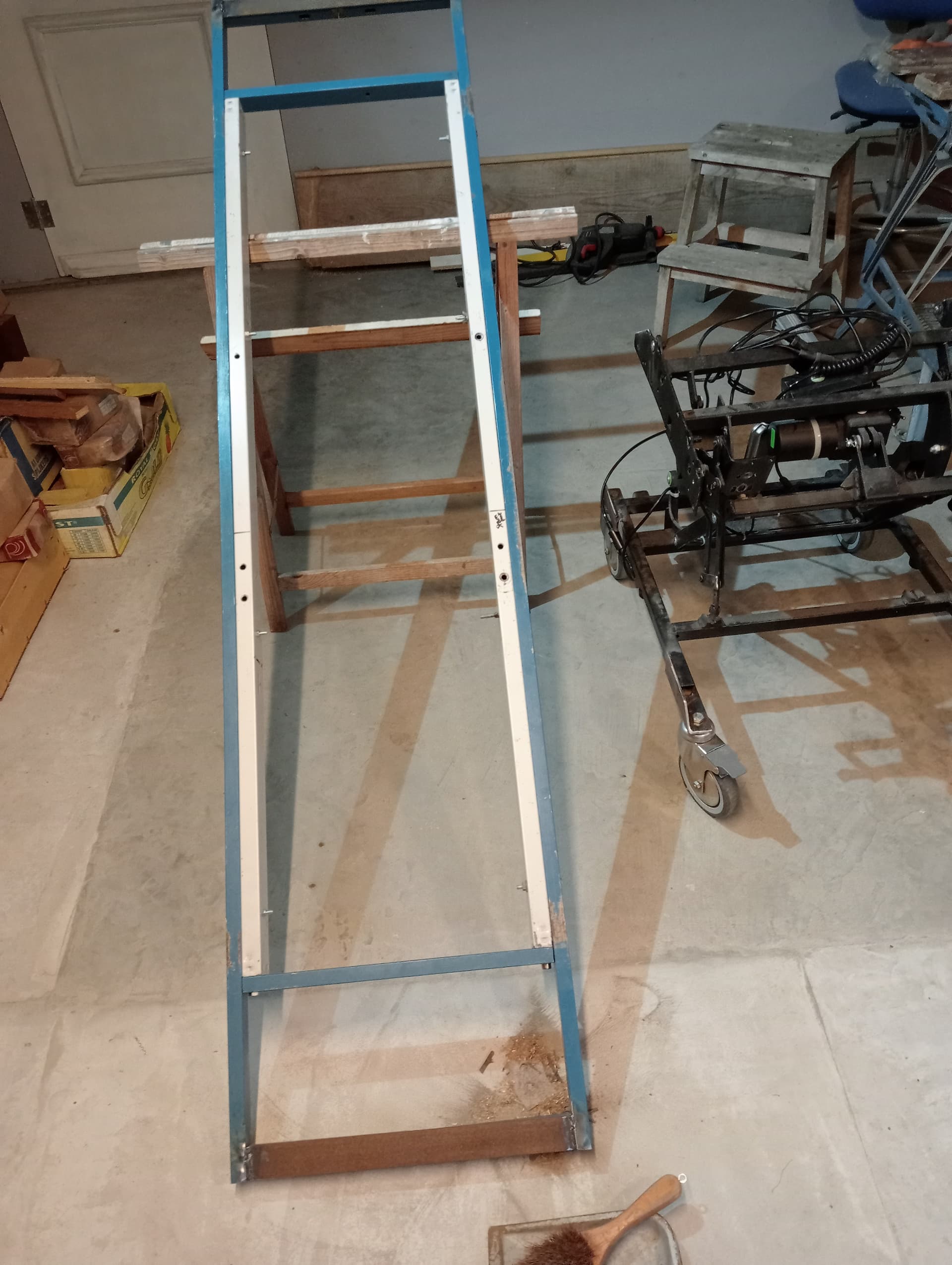 Van stevige oude ledikant kokermateriaal de basis gemaakt en proberen stabiliteit te creëren. Daarna van kleinere koker de lengte naar 1,90 meter gemaakt, helaas kan ik beweegbare onderstel niet breder dan 45 cm maken ivm tussenruimte in bestaande stoelframe.