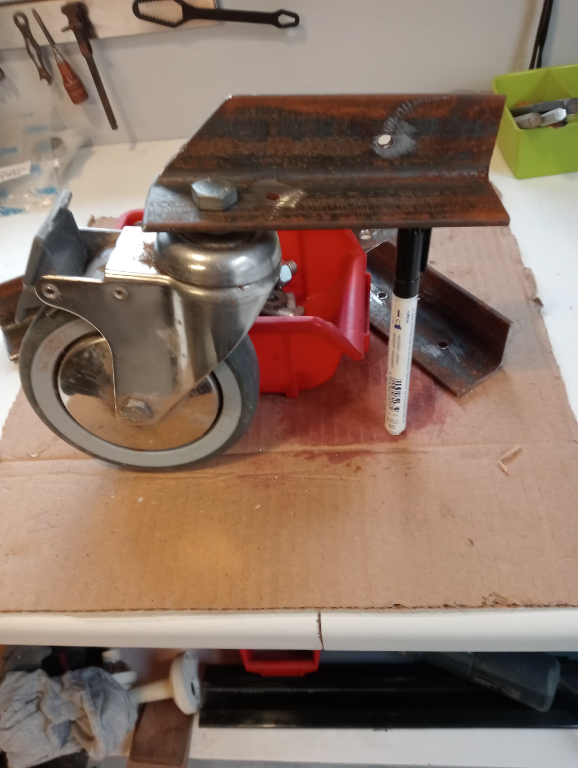 Vandaag nog wat gefreubeld en voorwerk gedaan. Hoekstukken gemaakt voor de zwenkwielen met rem te monteren. Deze op iedere hoek vastlassen, zodat onderstel ook iets groter wordt voor de stabiliteit.