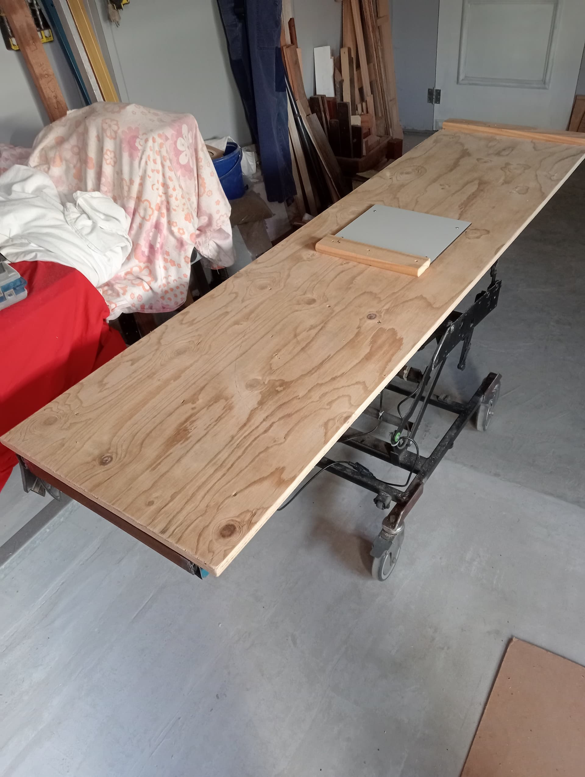 De tafel is verder opgebouwd en getest met zware grindtegels om gewicht te controleren of motor sterk genoeg is. De werking van motor is met inwendige spindel dus kan in principe niet zakken. Aan voorkant een aanslagbalkje gemaakt dat de brommer niet te ver naar voren rijdt. Dun plaatje trespa op plaat voor standaard te gebruiken zonder beschadiging plaat.