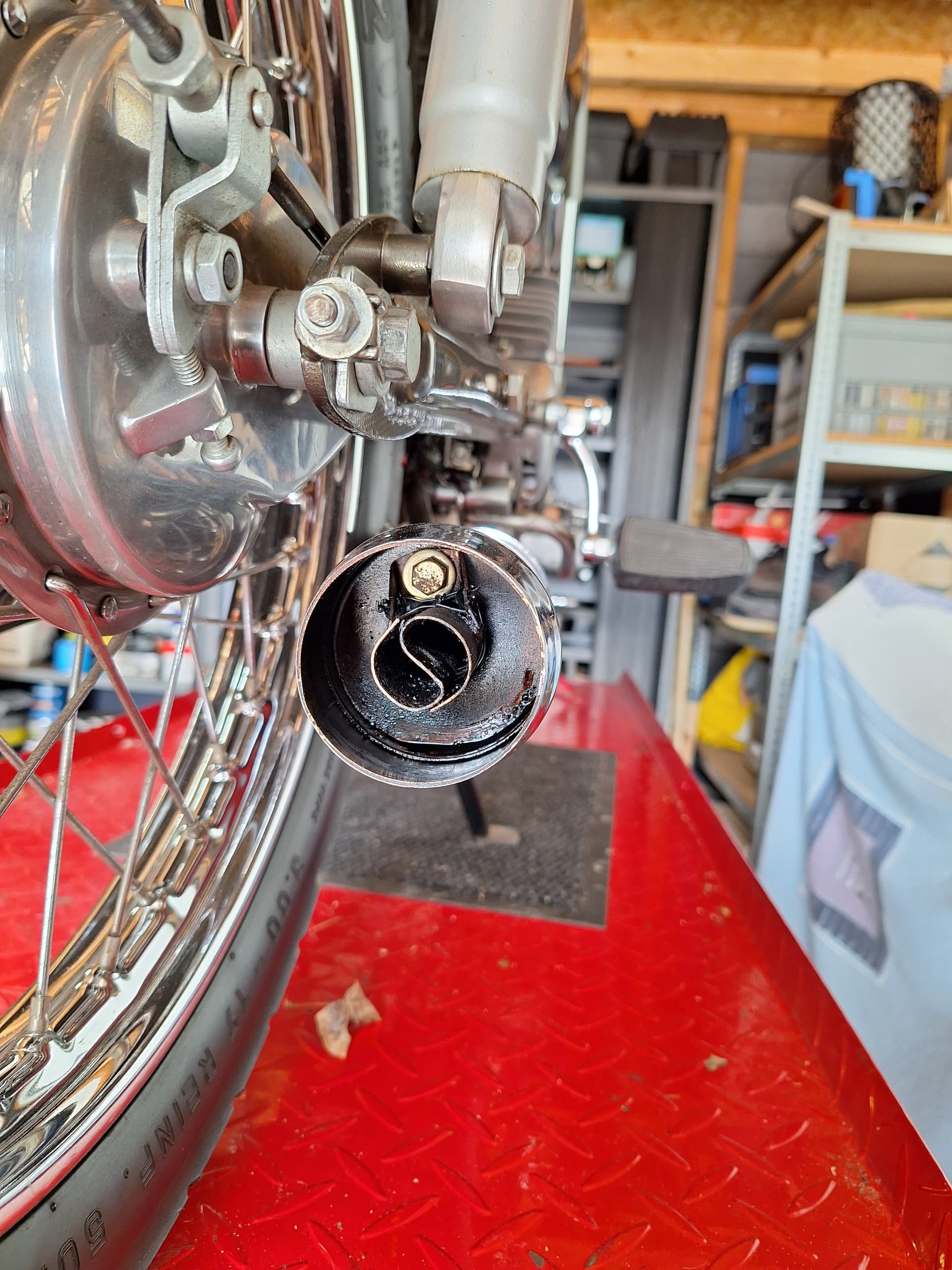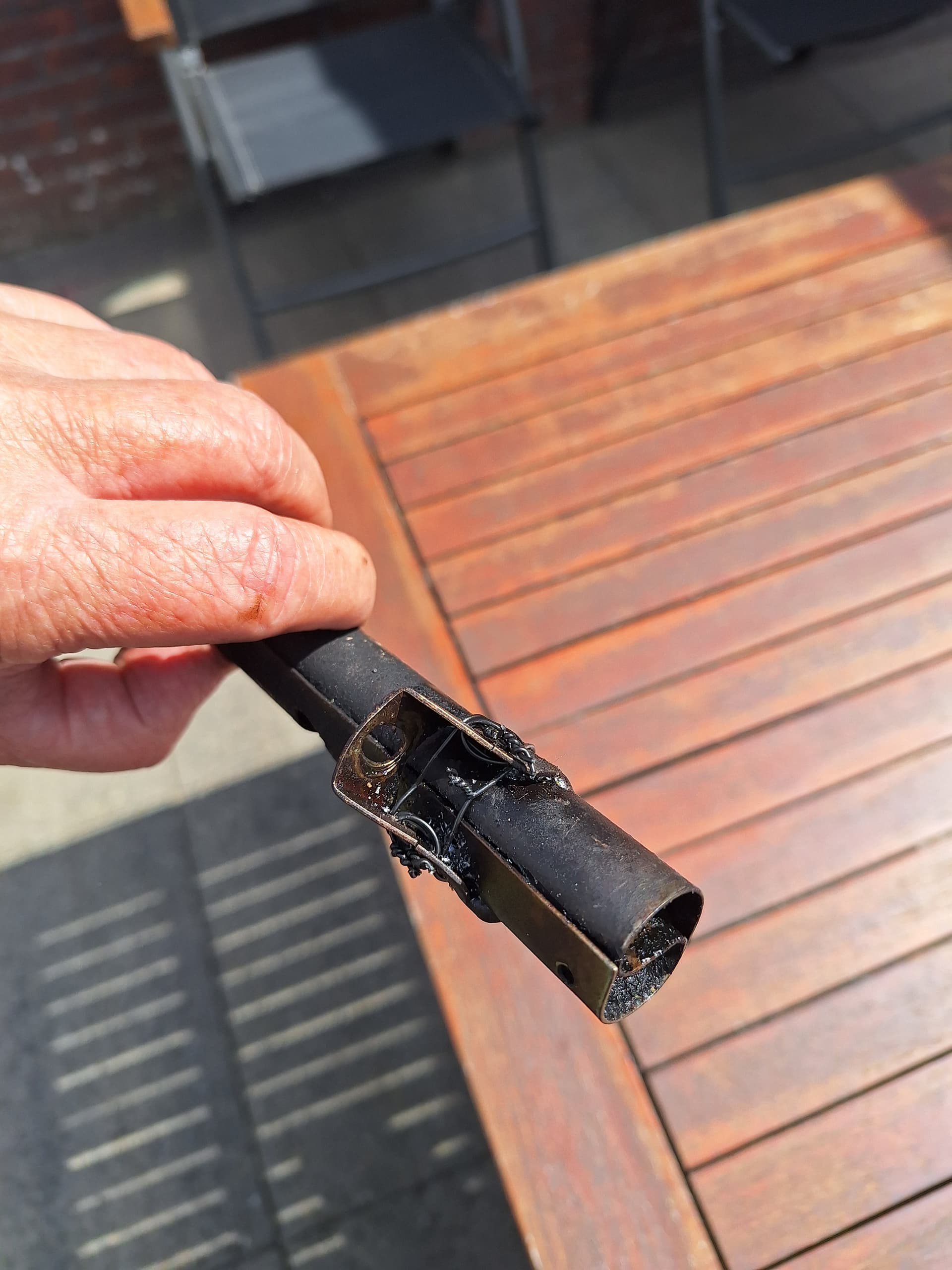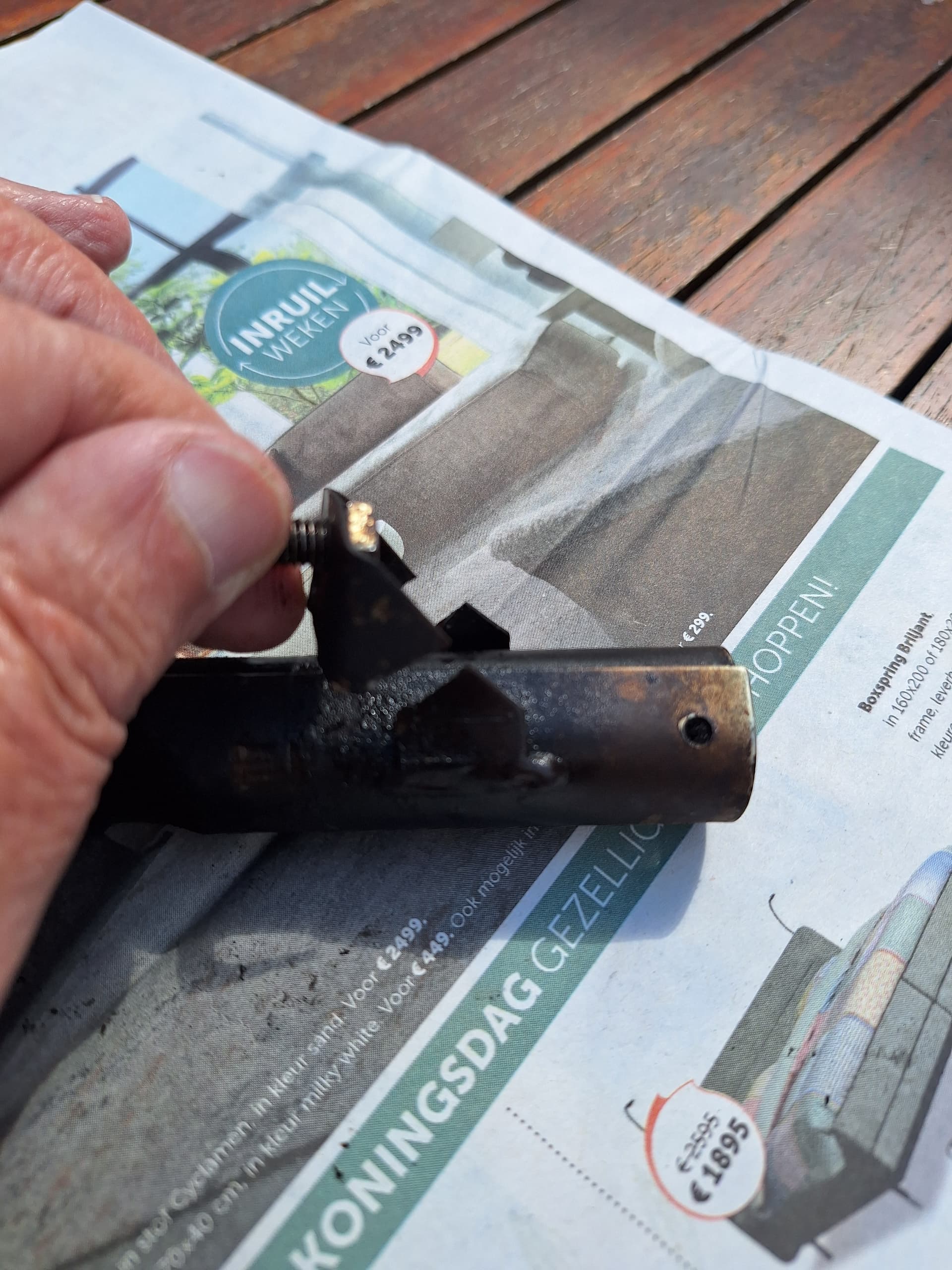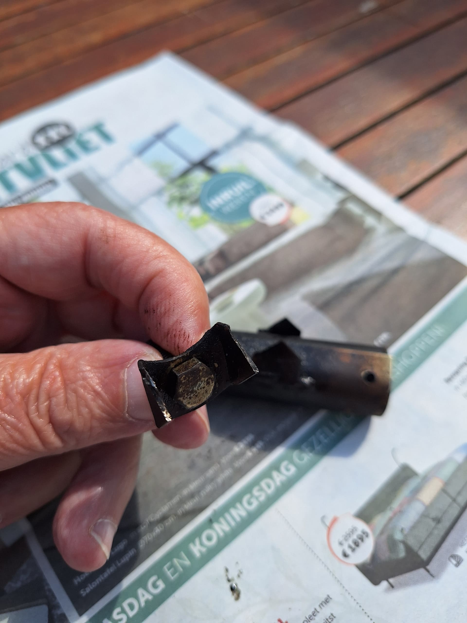 Ik heb tot bijna Kortgene de rit mogen meemaken. De demper van de uitlaat kwam naar buiten. Een beetje herrie zeg maar. De steun was doormidden gebroken. Aan de breuk te zien is dit in de afgelopen jaren gebeurd want er was slechts een klein blank stukje te zien, de rest was zwart. Erin gepropt en dan richting huis (Middelburg) gegaan. Vlak voor Arnemuiden vloog hij er weer eens uit.