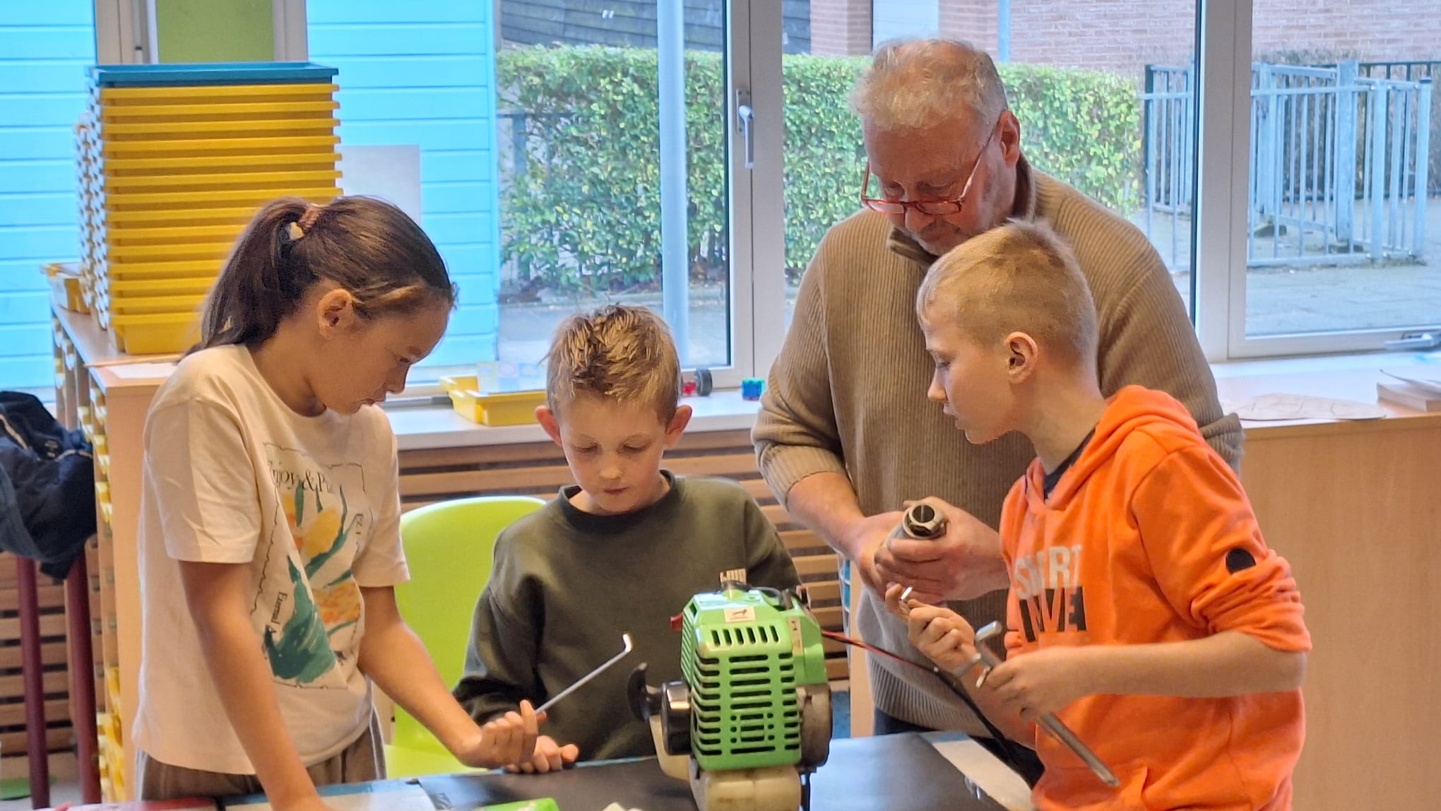 Hele ervaring om de jongens en ook meisjes een beetje techniek bij te brengen we hadden 2 grasmaai motors op de bank staan .